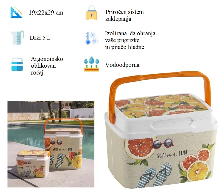 Hladilna torba s sprostornino 5 L. Z ergonomsko oblikovanim ročajem, lahka (1 kg) in atraktivnega videza. Izdelana iz kvalitetnih materialov zato je dobro izolativna. Je vodoodporna in odporna proti UV-žarkom.